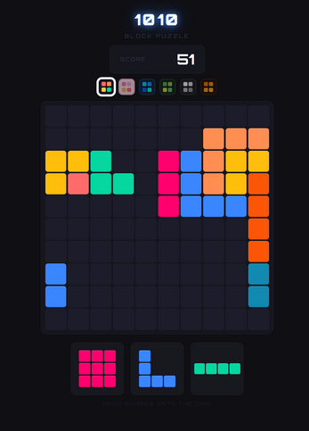1010 is a satisfying block puzzle game where strategy meets simplicity. Drag colorful pieces onto a 10×10 grid, complete rows and columns to clear them, and see how long you can keep the board alive.